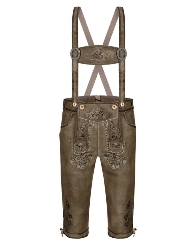 Bundhosen are usually worn with traditional outfits, like a trachten shirt, suspenders, and strong shoes or boots. They are popular at folk festivals like Oktoberfest, where people wear them as part of the traditional clothing. The design often includes decorative embroidery, buttons, or laces, which add to their cultural and visual appeal.